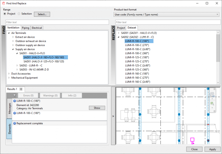 You can replace products in the entire project or within a selected area. The tool lists all products within the selection range according to discipline and product type. You can also filter the list with a free text.