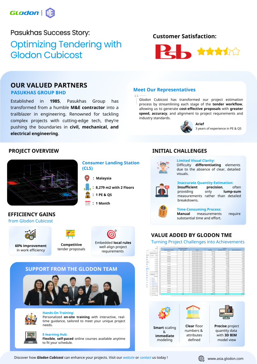 In Malaysia’s competitive construction industry, firms constantly seek advanced solutions to manage projects more effectively. Pasukhas Group Bhd, a major player in Mechanical, Electrical, and Civil Engineering, found their answer in Glodon’s BIM 5D technology through Cubicost—a cutting-edge tool for improving quantity takeoff, enhancing efficiency, and meeting stringent project requirements. This success story showcases how Pasukhas achieved faster, more accurate project delivery by embracing digital solutions tailored for modern construction challenges.