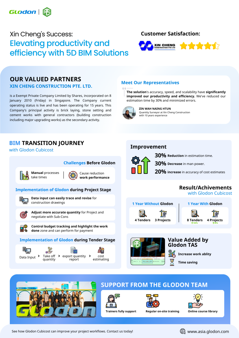 Xin Cheng Construction Pte. Ltd., a renowned player in Singapore’s construction industry for over 15 years, has significantly improved its operations by embracing Glodon's 5D BIM solutions. Specializing in bricklaying, stone setting, and cement works, the company leveraged these digital tools to enhance efficiency, reduce errors, and streamline workflows. By incorporating Glodon TAS into its processes, Xin Cheng has experienced remarkable improvements in project management, cost estimation, and overall productivity.